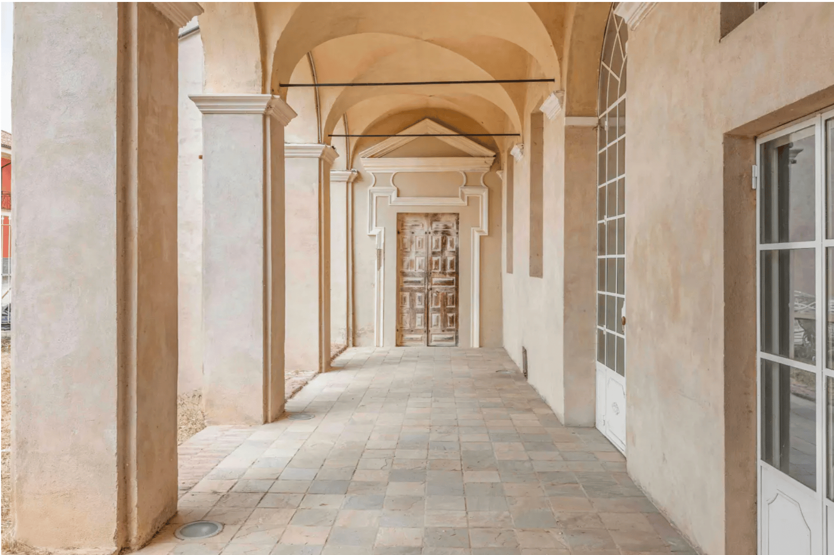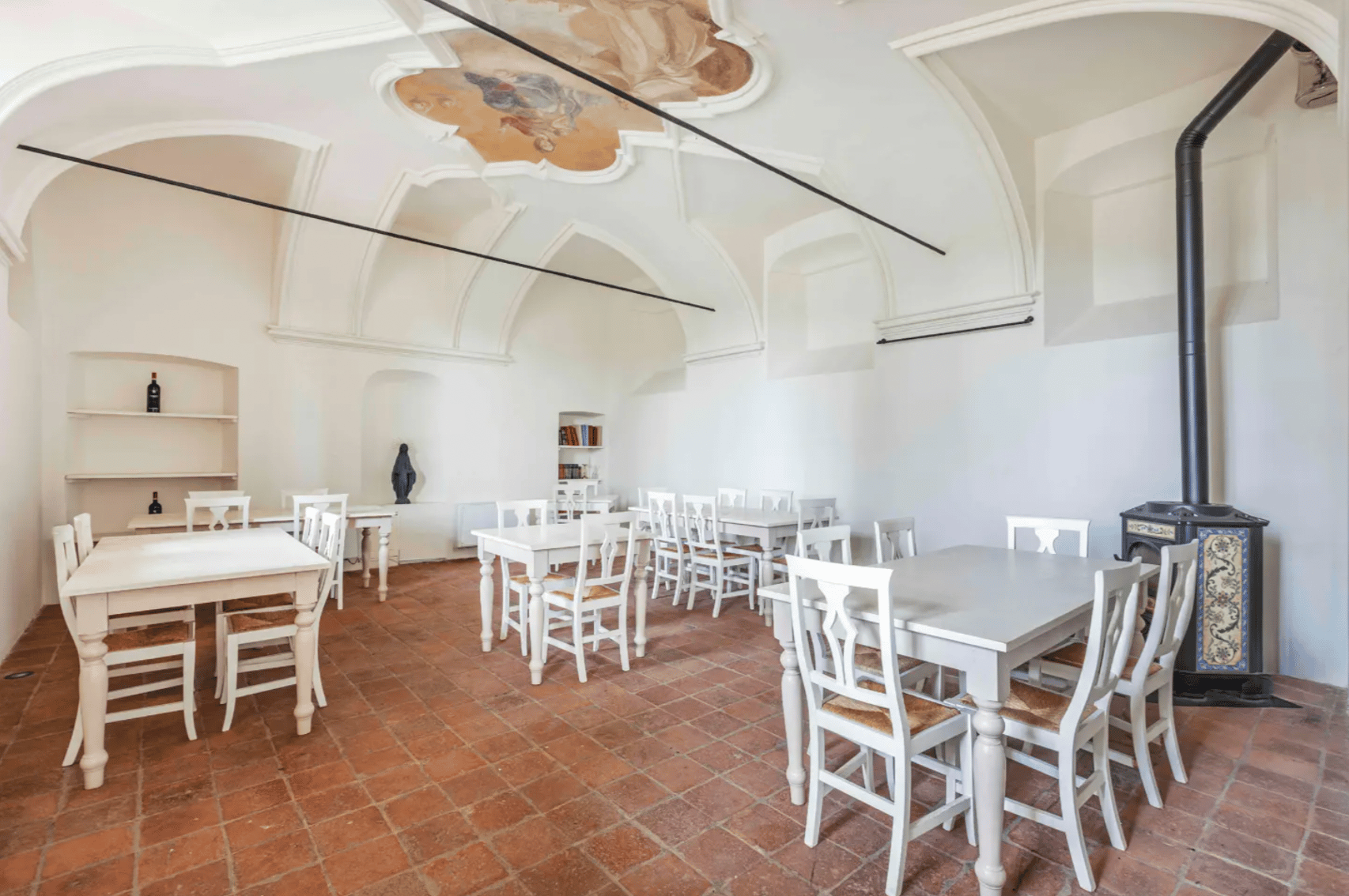 The conservative restoration has brought to light the building’s original splendor, preserving every historic detail while enhancing its timeless allure. Trompe-l’œil frescoes, handcrafted terracotta floors, sandstone staircases, and exposed wooden beams all testify to centuries of devotion and craftsmanship. Each element tells a story — a silent dialogue between art, faith, and nature.