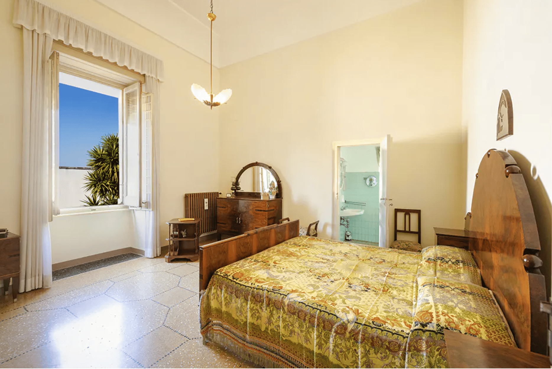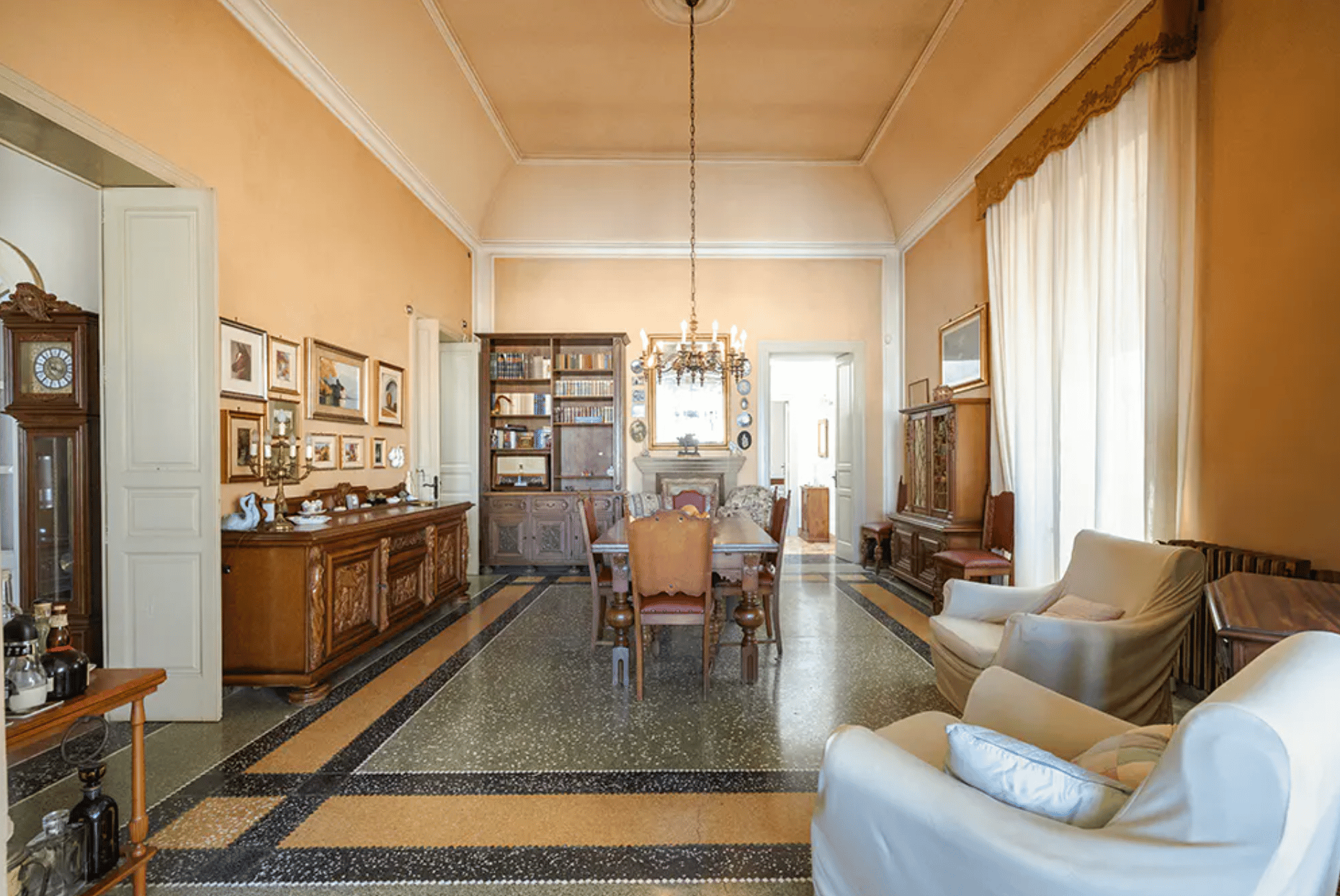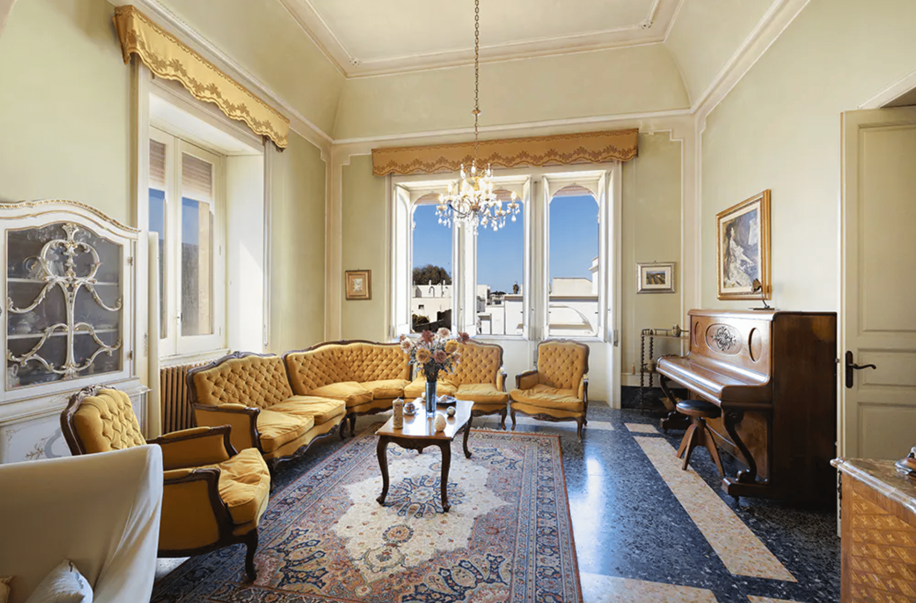 A wide stone staircase leads to the first floor, where a central skylight bathes the home in natural light. The elegant living room is the heart of the residence: spacious, luminous, and defined by pavilion vaults, subtle Art Nouveau influences, and a striking Lecce stone fireplace that anchors the space with warmth and charm.
