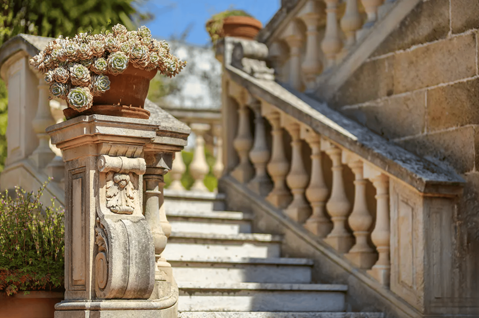 Surrounding the home is a lush private garden, home to an ancient citrus grove of oranges, lemons, and mandarins. This fragrant outdoor sanctuary is framed by local stone details and a welcoming staircase that creates a truly enchanting arrival experience.